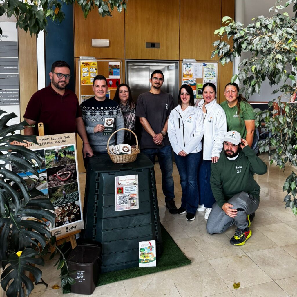 La mañana del miércoles, el equipo de La Palma Orgánica estuvo presente en el ayuntamiento para resolver dudas, proporcionar orientación práctica y explicar en detalle cómo iniciar el compostaje doméstico. Además, se realizó la entrega de kits de compostaje a tres familias del municipio, incentivando la adopción de esta práctica en los hogares.