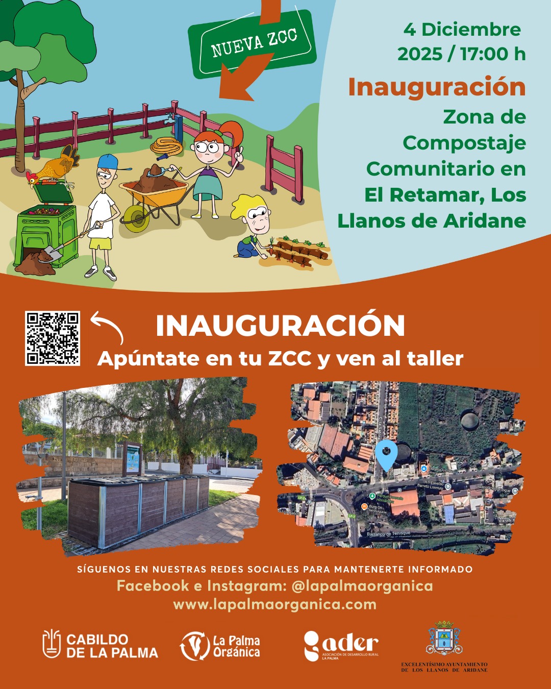 La Palma Orgánica dará un nuevo paso en su apuesta por la gestión sostenible de residuos con la apertura de una nueva Zona de Compostaje Comunitario (ZCC) en el barrio de El Retamar, en Los Llanos de Aridane. La inauguración se celebrará el próximo jueves 4 de diciembre a las 17:00 horas, en la esquina de la Avenida Eusebio Barreto con la calle La Sabina.